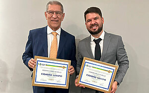 Roberto Corrêa de Mello e Leandro Mello foram agraciados com o Título de Cidadania Goiana durante a solenidade que celebrou o trabalho dos compositores musicais. A sessão solene foi realizada na segunda-feira, 10, pela Assembleia Legislativa de Goiás (ALEGO), e proposta pelos deputados Bruno Peixoto e Delegado Eduardo Prado.