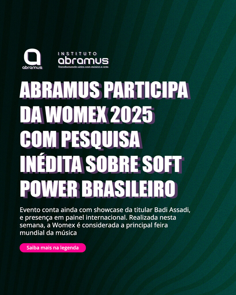 A Abramus, por meio do Instituto Abramus – seu braço de projetos estratégicos e de impacto – chega à 31ª edição da WOMEX, principal feira mundial de música, que acontecerá entre 22 e 26 de outubro de 2025 em Tampere, na Finlândia. Durante todo o evento, a entidade conduzirá uma pesquisa sobre a percepção do soft power brasileiro entre os participantes não‑brasileiros.
