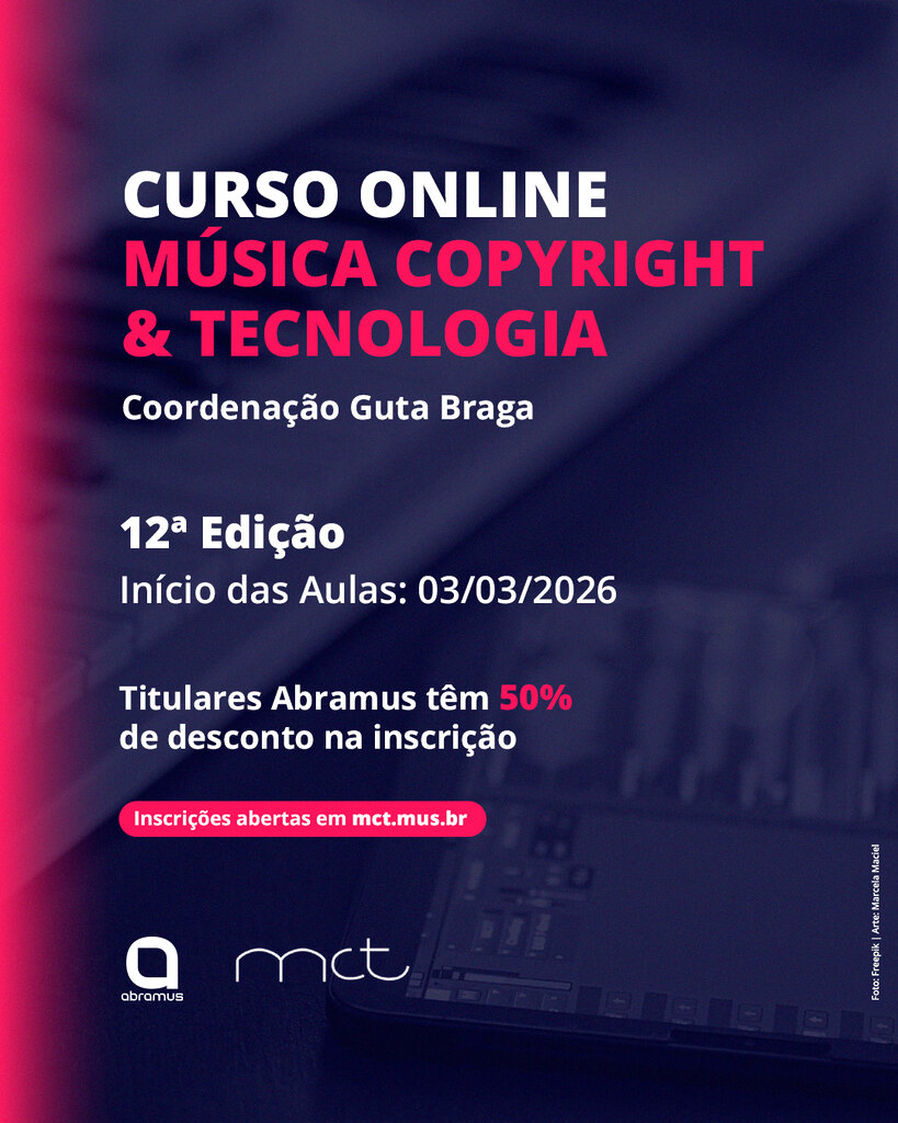 As inscrições para a 12ª edição do curso Música, Copyright e Tecnologia já estão abertas! Realizado pelo MCT com o apoio da Abramus e sob a coordenação de Guta Braga, o curso começa no dia 3 de março, e é direcionado a autores, artistas, editoras e selos.