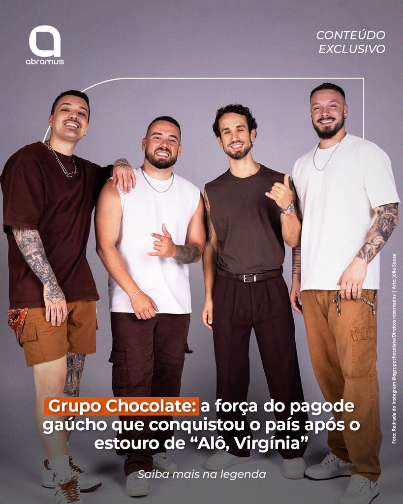 Praticamente qualquer usuário de redes sociais já deparou com a música viral Alô, Virgínia, do Grupo Chocolate. O quarteto gaúcho de pagode, formado por Luiz Alberto, Gabriel Rocha, Matheus Dias e Léo Maia – todos titulares da Abramus –, tornou-se o centro das atenções com um sucesso estrondoso que ultrapassou as fronteiras do Rio Grande do Sul e alcançou o Top 5 Global da playlist Viral Songs no Spotify.
